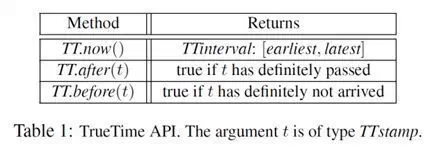 TrueTime API 是一个非常有创意的东西,可以同步全球的时间。上表就是TrueTime API。TT.now()可以获得一个绝对时间TTinterval,这个值和UnixTime是相同的,同时还能够得到一个误差e。TT.after(t)和TT.before(t)是基于TT.now()实现的。