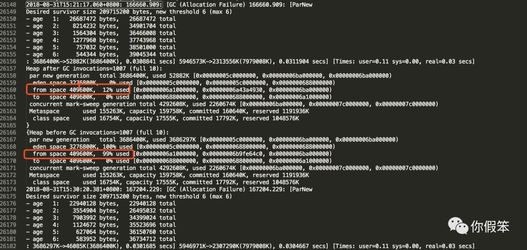 from space 409600K, 99%,找到第一次情况发生的位置,发现并不是一开始就有这种情况的,而是到某个时候才开始有,并且全部集中在中间某一段时间里,那我立马看了下第一次发生的时候的上下文,发现之前有过一次Full GC和一次CMS GC